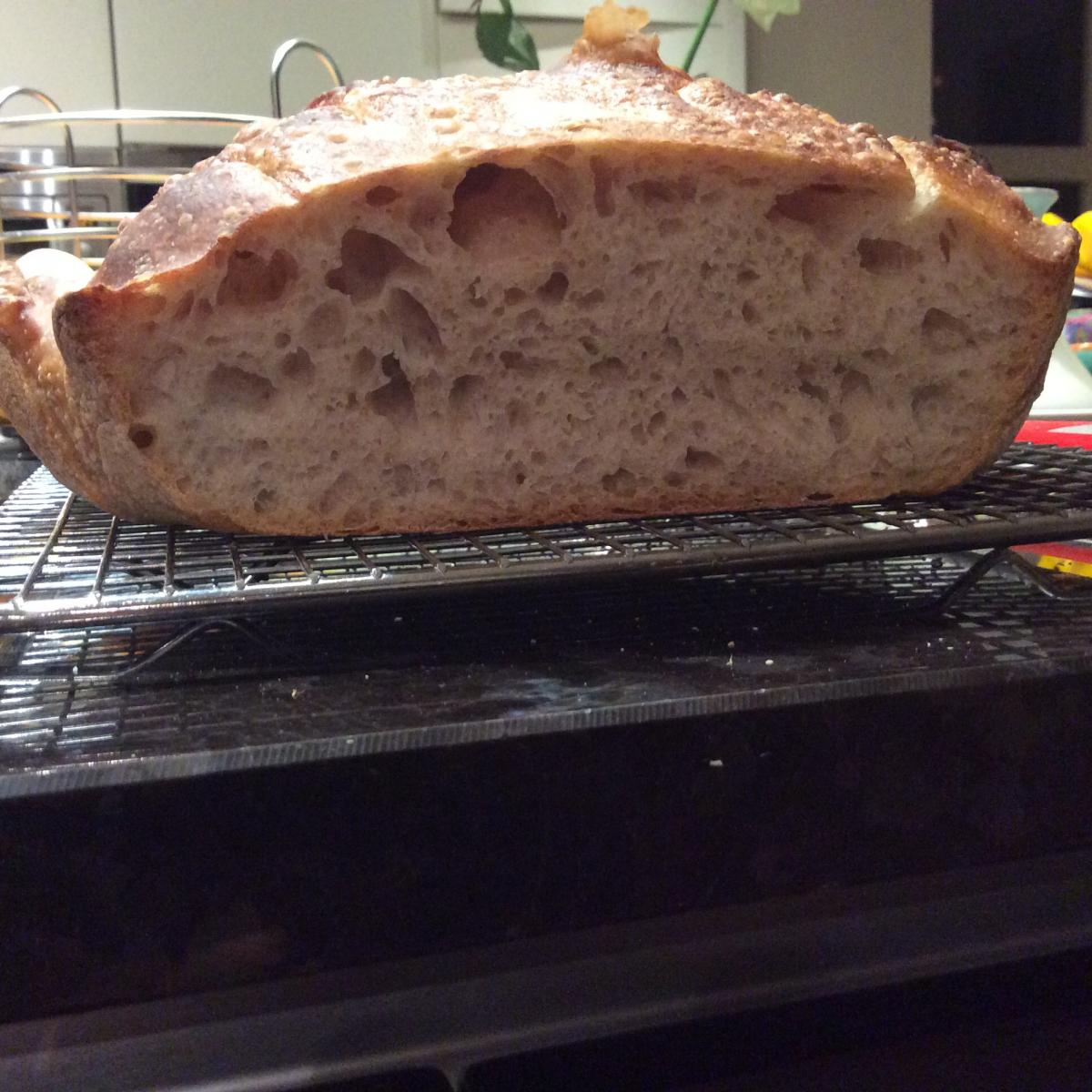 It was 5pm by the time I'd done both 1 hour rises, so I decided to let the loaves rise for 24 hrs in the fridge, thinking I'd just bake after work today. But this morning both loaves had risen really well in the fridge, and one really looked perfect so I did a rush job and got it into the oven on a pre-heated pizza stone, steam created by pouring water into a baking tray on the bottom of the oven, while making the children's breakfast. My husband took it out after I went to work, and it looked good with a nice crumb. As others have said the proven loaf was pretty liquid and hence the loaf is oval rather than round as I had to roll it onto the pizza stone as even with lots of semolina it stuck to my oven peeol.