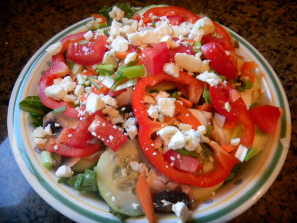 An unusual lunch for us...a shell pasta with meatball, green with blue cheese and potato salads, some avocado and a golden delicious apple.