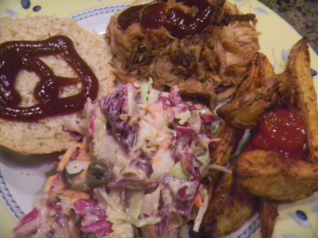 Smoked pulled pork served with homemadebiuns, slaw and baked wedge fries.