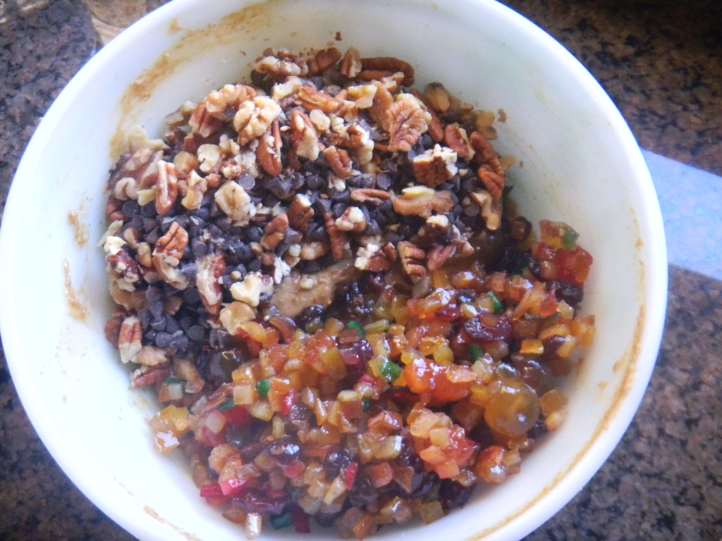 See that little bit of dough peaking through the middle of bowl between the mountain of nuts on one side and snockered fruits on the other? Not much dough holding thisnall together.