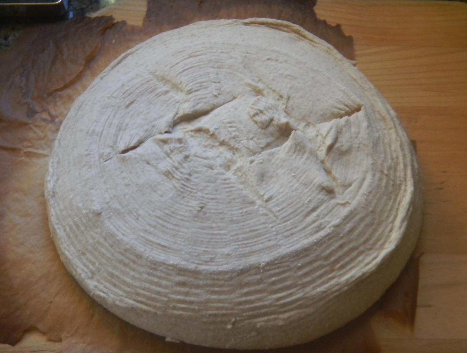 It was so wet it stuck badly and spread faster than the just banged, young, inflating universe. Before I could slash the boule, it was at least 4 inches in diameter bigger than when it came out of the basket. These things happen when you get the hydration 4-5 % too high - so don't do it:-)