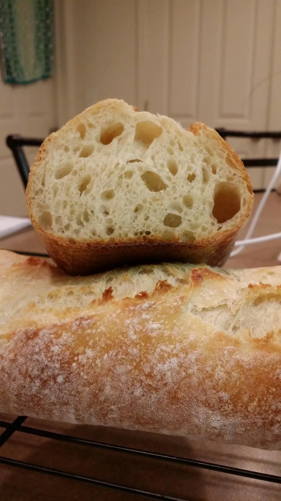 I got a decent oven spring and the loaves bloomed more than I expected, so much so that the dough seemed to rip open more than bloom. The crumb was fairly light and spongy, but not quite as open as I would like. The crust was thin, crackly, and delicate. It was actually one of the best crusts I have produced. I love constructive criticism, I am always looking to improve and I know I have a long way to go before I can say I am completely satisfied with my results. Please let me know what you think and provide any suggestions you may have. Thanks!