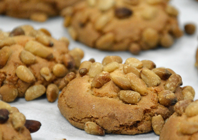 That picture hurts.  I can taste them.  Back in NY where nearly all bakeries are Italian influenced, or were when and where I grew up, we couldn't make enough of these puppies.  Cool thing was we'd pipe the dough to on parchment and then have a full sheet pan full of pine nuts.  Once all the cookies were piped we'd grab the parchment by the corners and swiftly swing it up and land the cookies down in the pan of pine nuts and then back onto then out and back on the pan.  Took a bit to get this nifty trick down but the guy who showed me this trick had me in awe.   Sorry, sorry, the picture brings back such memories.