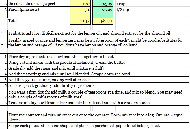 Chef Settepani  took us through a wide range beautiful, colorful, and delicious Italian celebratory breads and pastries, in the weekend class. This Pandolce Genovese is one of the holiday treats we made. It is full of fruit and flavor (orange, lemon, almond, anise, raisin), fairly quick to make, and very nice for gift-giving! :^)