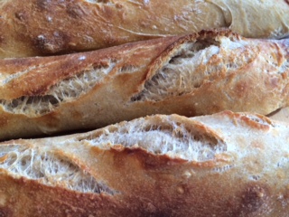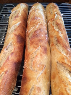 My niece also loves baguettes, so I made David's San Joaquin baguettes.  I made progress, but they weren't as good as David's.  I still have a long way to go!  Still learning the best way to work with the high hydration dough, the shaping and scoring.  It was better than my last attempt, so I will keep trying. My niece really liked them, and I made baguette sandwiches for my sister and niece for the plane ride today back to the Midwest. I also gave them a few slices of the banana bread, so they will have a nice meal on the plane.