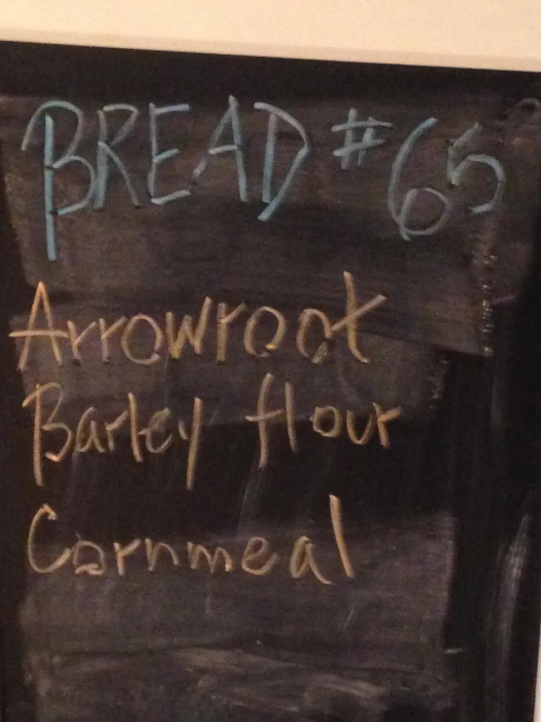 This bread - bread #65 - had arrowroot flour, barley flour, cornmeal, oats and caraway seeds. Did a sponge, autolyse and a soaker. Not difficult. Beautiful and great taste. Even enjoyed the wonderful crinkly noises the bread emitted upon being removed from the oven.