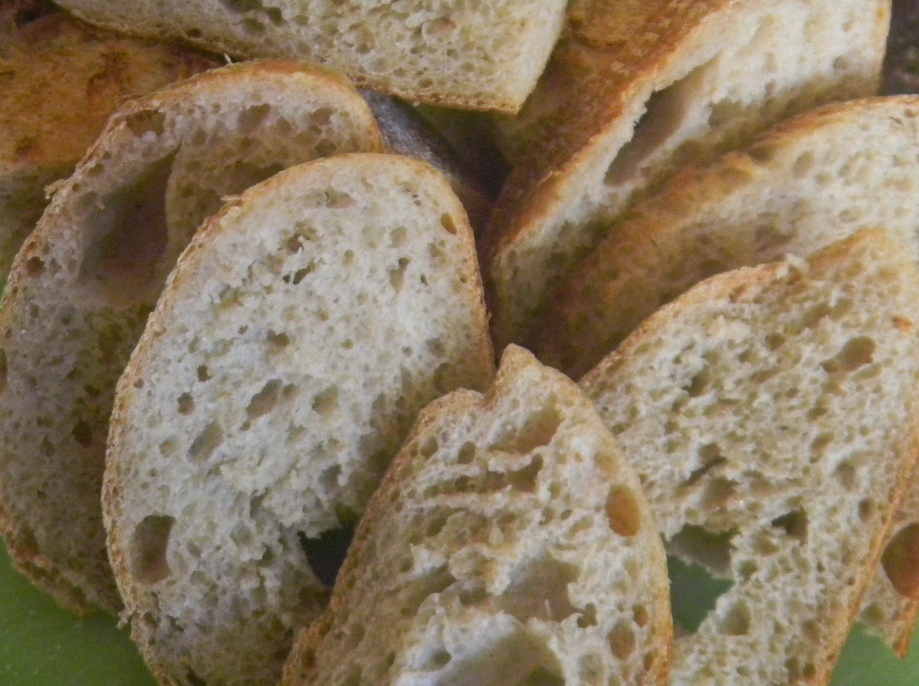 It browned and blistered well enough and the bottom thump sounded hollow too. We will have to wait and see how the crumb came out with the much lower hydration of this bake. The crust is thin and softly chewy. The crumb is soft, open, moist and glossy. The taste is superb! I prefer it to the same bread made with the same but not sprouted whole grains. We will have to see what the wife says about it tonight. I can see olive oil, Parmesan, Pecorino, fresh basil, and roseary with a grind or 3 of pepper on a plate for dipping right now.