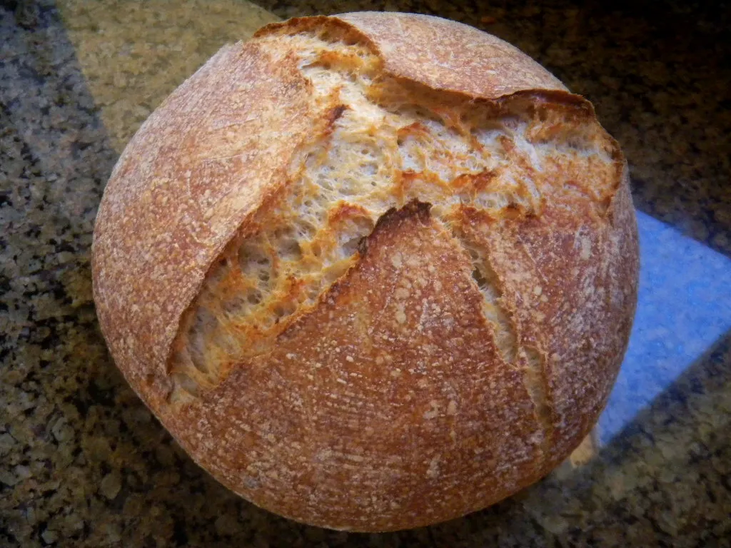 Once the lid came off we turned the oven down to 425 F – convection this time. The bread sprang and bloomed well under steam. And 5 minutes under the lower dry heat we took the bread off the cooker bottom and finished baking it on the stone. 10 minutes after the lid came off, 30 minutes total, we called the loaf done, turned off the oven and let it sit on the stone for 5 more minutes and then transferred it to a cooling rack.