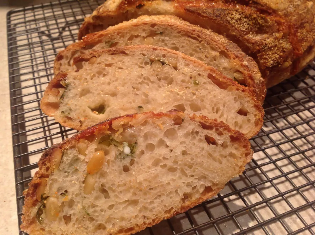 The pine nuts put it over the top. What a great idea to "deconstruct" a dish/flavor/sauce for the purposes of a great sourdough loaf!