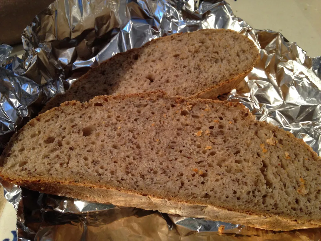 Bread #66 is a combination of arrowroot flour, whole wheat flour and flaxseed meal for 62 percent non-white flour contribution. Beautiful, tasty and impressive oven spring. Also easy to make. It can be made over the course of two days, or you can wake up in the middle of the night for one-long-long-day bread.
