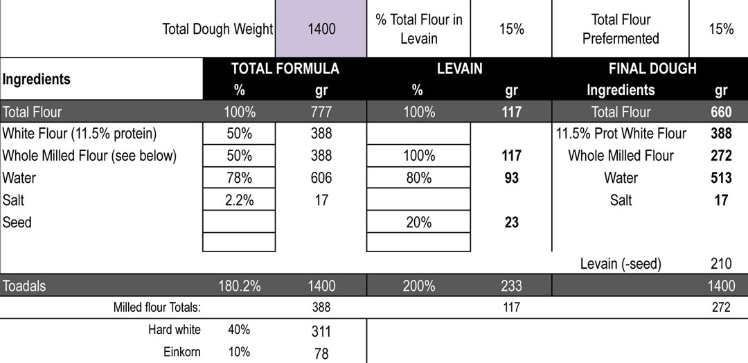 First night:  Refresh levain.  Ours is grown @ 75-80˚F @ 80% hydration; rests on countertop between daily feedings of a hi-fiber Gerard Rubaud ration.  If you feed intermittently, refresh at least once immediately prior to this one.