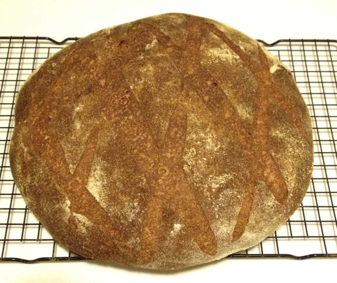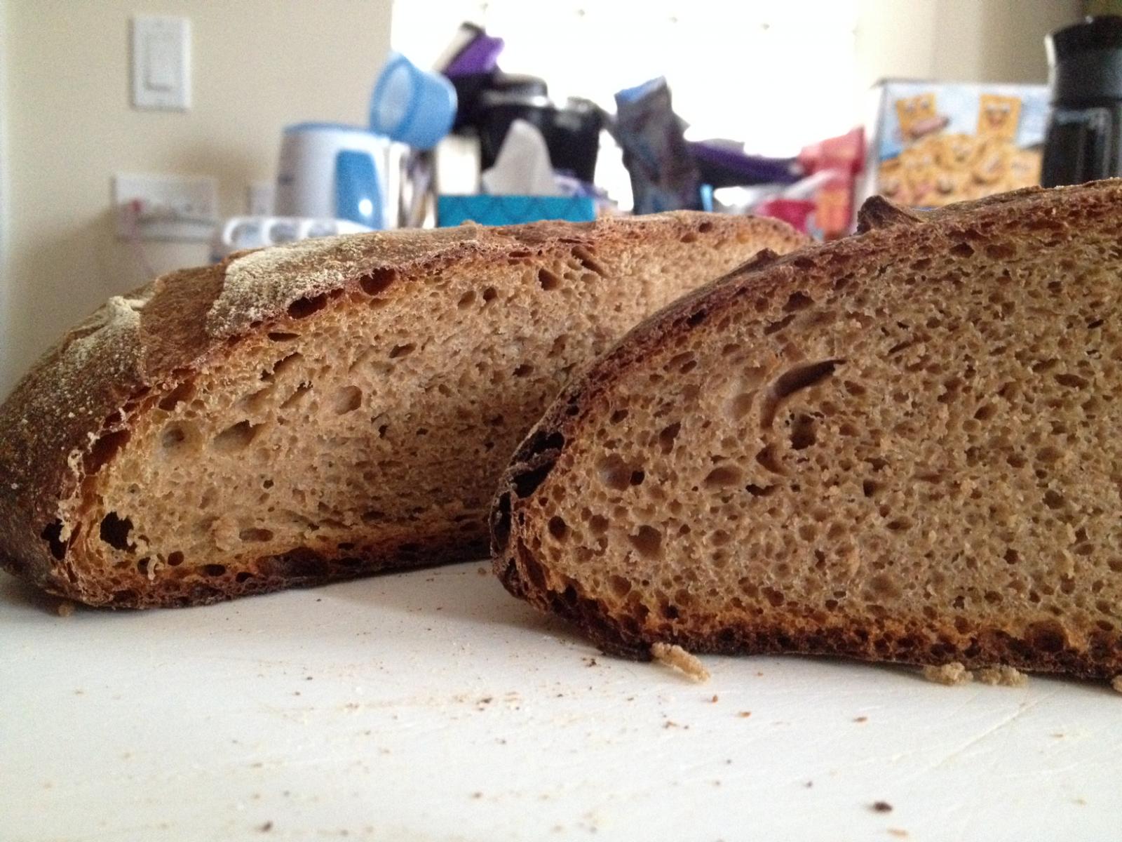 I gave this one a pretty bold bake, with steam for 15 minutes, without steam for an additional 60 minutes with the oven cracked for the last five. I left the loaf in the oven with the door cracked after it'd been turned off for another 10 minutes. I let it sit for around 15 hours before had some at breakfast this morning. It went well with a double cream brie and blackberry preserves. The taste was pretty nice. I'm looking forward to seeing how the taste evolves on my sandwich for lunch tomorrow.