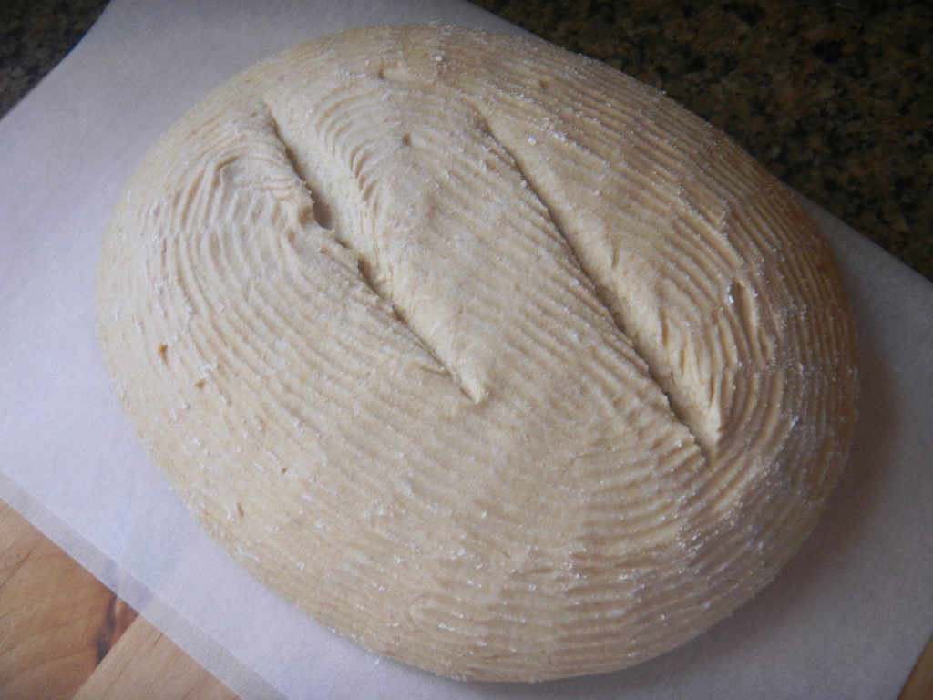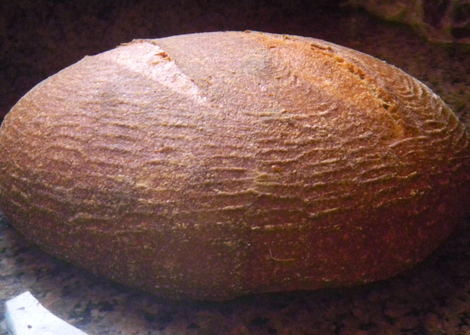 More than 2 years ago Lucy and I baked out first 100% Kamut Bread that was at 102% hydration. Back then we weren't using straight rice flour in out baskets and the dough stuck causing a nasty disfigurement here: