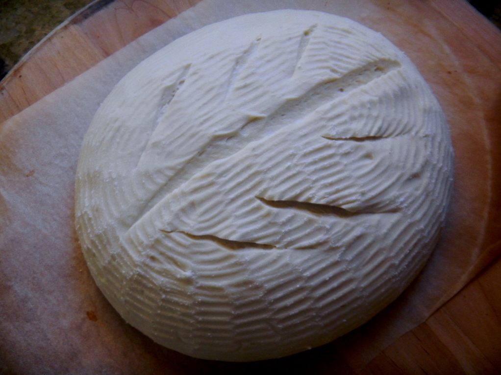 We un-molded the dough and slashed it in a decorative way, at least for us, hoping the long middle slash would get an ear and that this bread would blister and brown well.  We slid the dough on the bottom stone and turned the oven down to 450 F for a 15 minute steam bath.