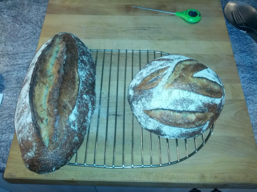 I spent the last couple of years pining to bake on a regular basis but found that time and other commitments kept getting in the way. Well, I'm glad to say that I think I'm back again. I've baked for the past three weeks and am loving every second of it. I was a little out of practice but I guess it's like riding a bike. My first sourdough effort produced a couple of Tartine bricks- served me right for jumping right into the deep end. I was a bit less adventurous the following week with a more routine SJSD and was rewarded with a couple of wonderful loaves. Easily the best sourdough I've made. This weekend required something a bit lighter so I ventured into some modified Gosselin baguettes with added levain, reduced fresh yeast, cool overnight autolyse, long bulk ferment. These, too, may have been the best baguettes to date. They were very wet which made shaping and scoring an adventure but the end result was suberb- fantastic crumb, thin splintered crust, and a fantastically complex flavour. Last night was the best pizza yet- Margherita and Flammekueche- the 'pizza steel' is amazing. These pizzas were cooked in my regular home oven in about 3 and a half minutes.