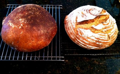 Having only 1 Dutch Oven, the decision was made to bake both at the same time. Hers in the DO and mine on the ceramic tile baking deck in my oven. Then the oven was steamed my standard way – both Sylvia’s steaming towel and my baking pan of lava rocks with a near-boiling water pour-over.
