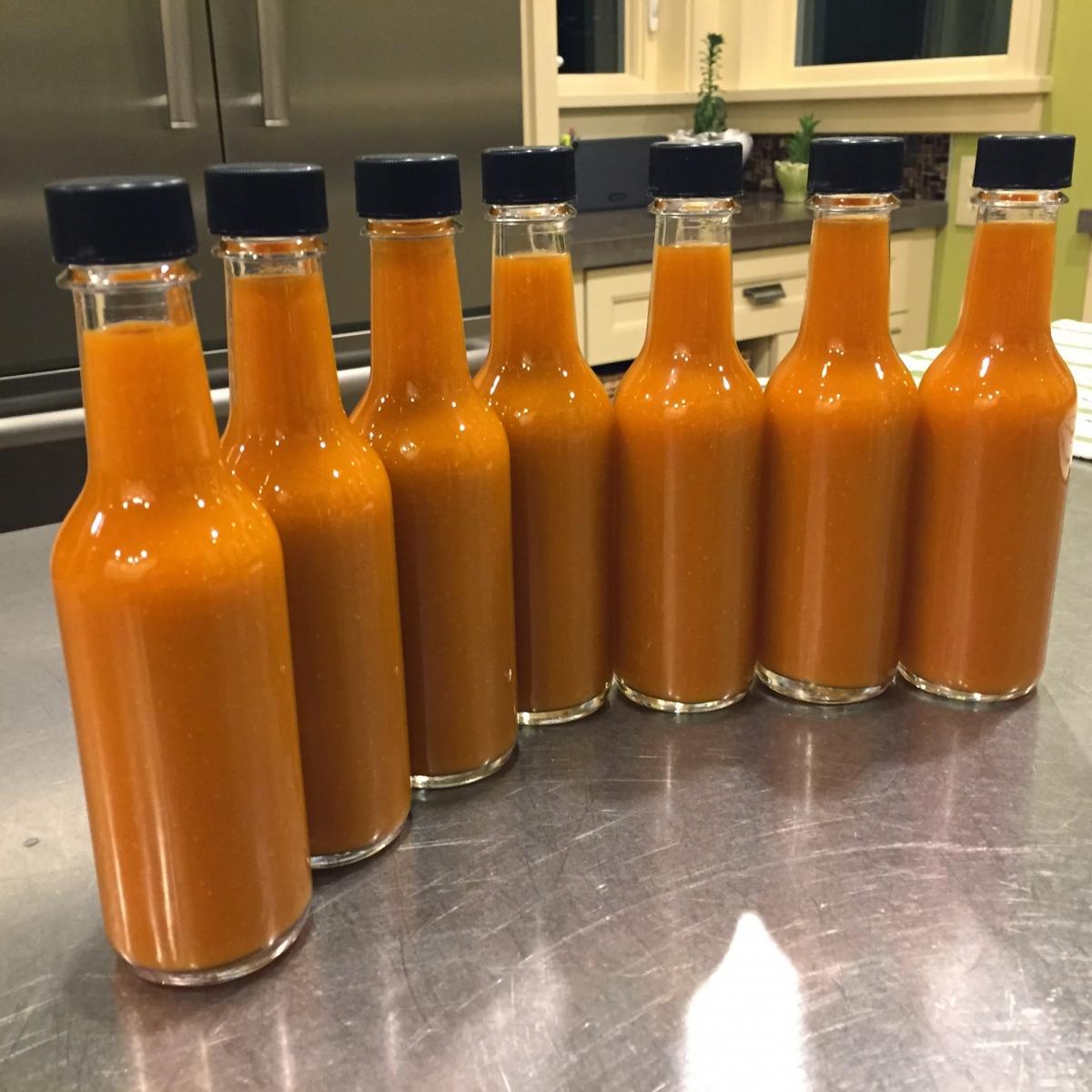 I tend to vary the hot sauce by what sort of peppers are available -- purchased or from my garden -- so every batch is a bit different. For this last batch, I used 7% red chillies, 23% habanero, 14% jalapeño, and 55% white vinegar (that's my poor man's baker % for sauce). Add in salt, a few cloves garlic, blend really well, bring to a boil, and cure for 3 days before bottling. Cheers