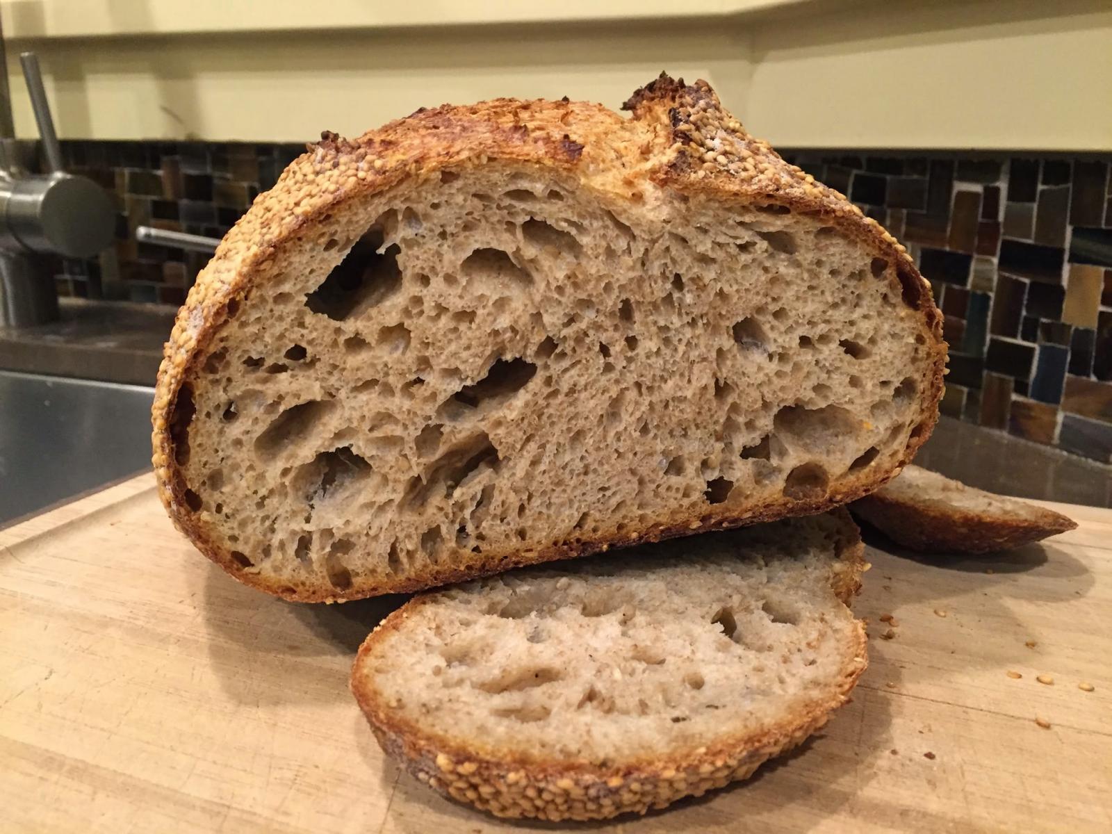 I then built on the Field Blend #2 recipe by adding toasted sesame seeds, inspired a fellow TFL user (I think) and his great, if dormant blog. The results were stellar – one of my favorite loafs in a while – as I really loved the flavor and dimension added by the toasted sesame seeds. It takes everything is different direction than my normal levain breads – nutty and savory – I think it would be amazing toasted with cheese. I’m going to keep on this one, and will try adding toasted sesame into other breads to see how it goes (bonus: it’s much easier to make and incorporate sesame seeds than some of the poridges I’ve been trying).