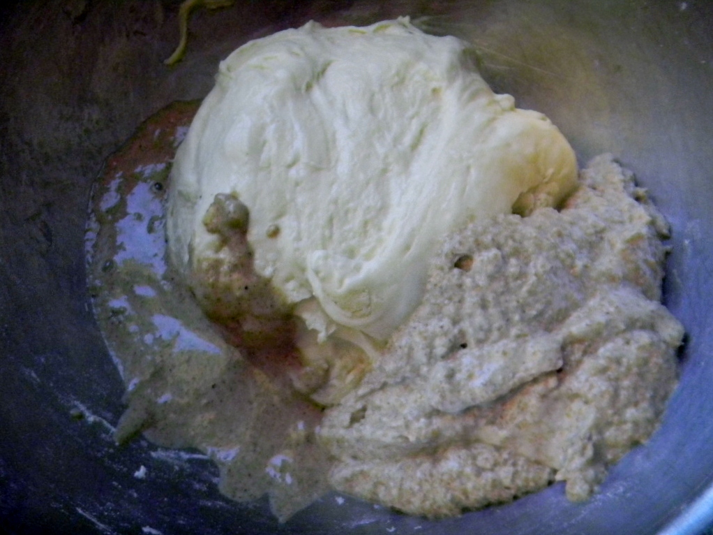 The only whole grain flour in the dough were the sprouted ones in the baked/ scald which were now completely hydrated at 100%. Thursday, in the late afternoon, the autolyse of dough flour, water and baked scald was started and completed in 1 hour. We sprinkled the Pink Himalayan sea salt on top of the autolyse so we wouldn't forget it.