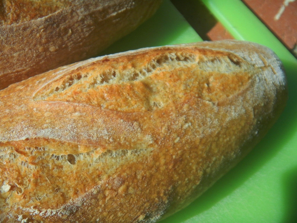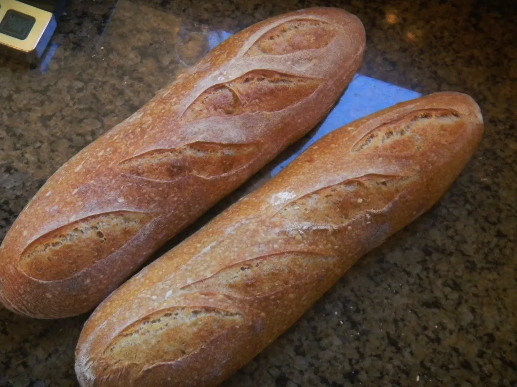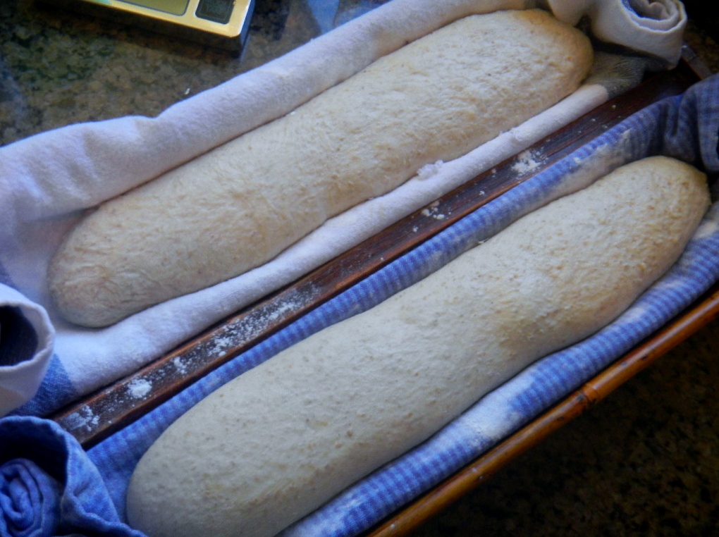 Over proofing does seem to be making a comeback! Somehow we managed to put these in the bamboo form seam side down rather than seam side up. I thought about flipping them twice to get the seam side down on the peel for slashing but, after flipping them once to seam side up, the bottom looked pretty good so we slashed the seam side instead. I don't know if that made any difference in not having any ears. I figure at 1 or two baguette bakes a year, we might figure them out in another 10 years or so - but maybe not:-)