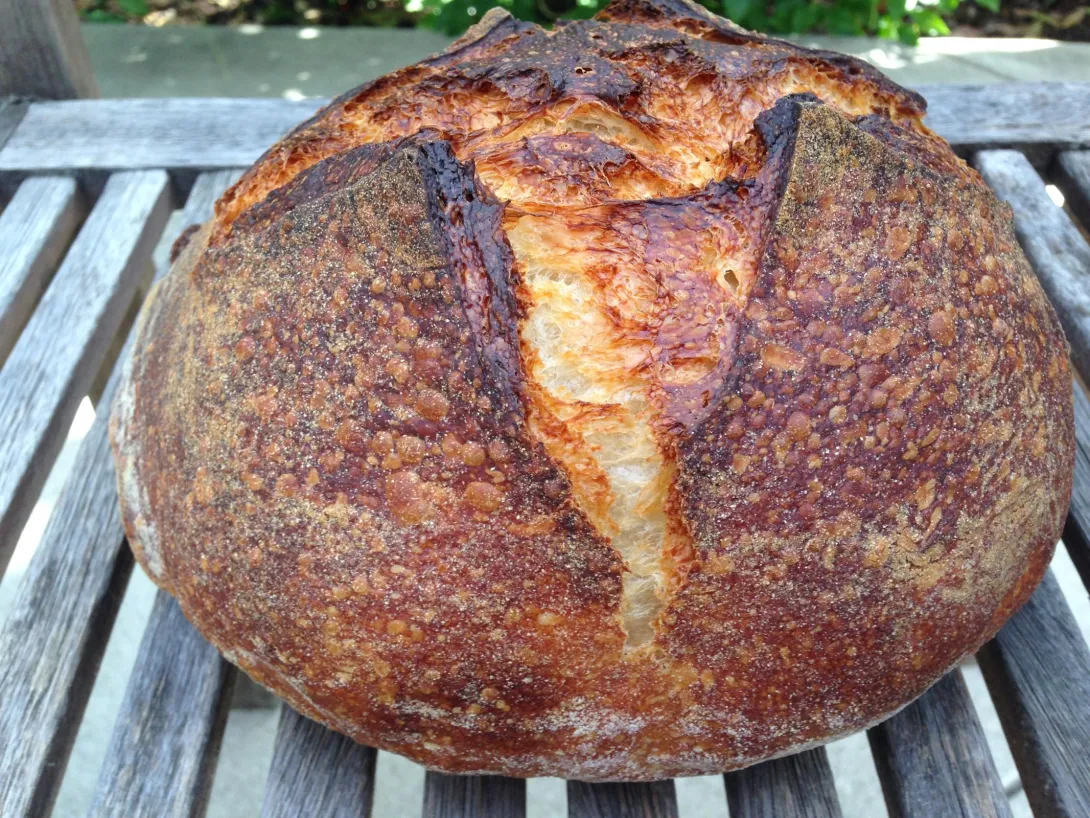 even though she uses the equivalent of a dutch oven to bake.  I followed suit though I used a real dutch oven.  Not sure if the spraying was responsible for the blistering but I decided to follow her as exactly as I could, including the longest and warmest bulk ferment I have ever done.
