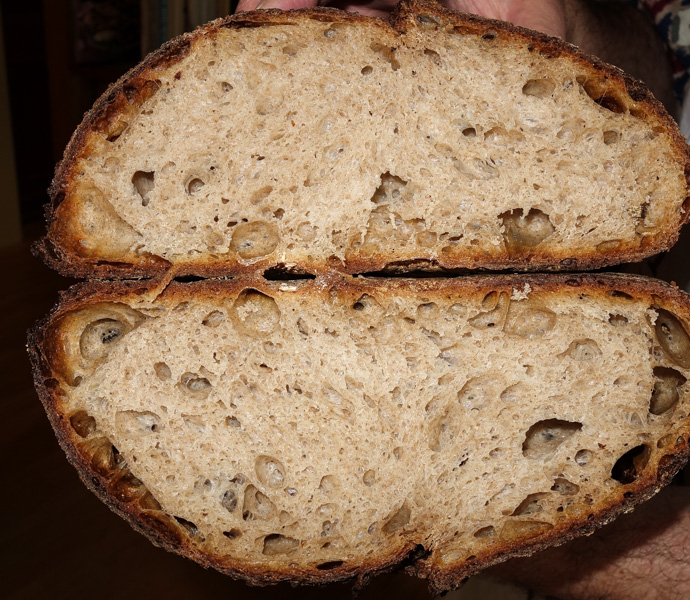 Here is a crumb shot of the SD batard and a close up of one of the boules. The batard finished at around 1200g and each boule was around 700g.
