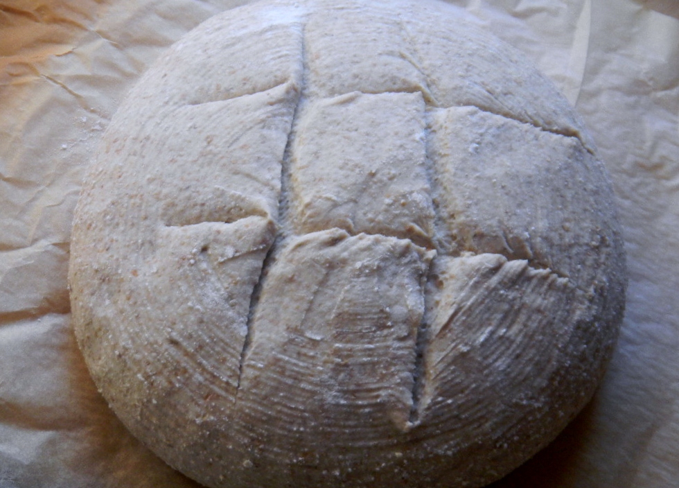 Once the gluten was developed we took of 73 g of dough to use as old dough for a pizza on Friday.  After a 30 minute rest we formed the dough into boule and then 10 minutes later did a final shape on it and placed it in a rice floured basket – seam side up.