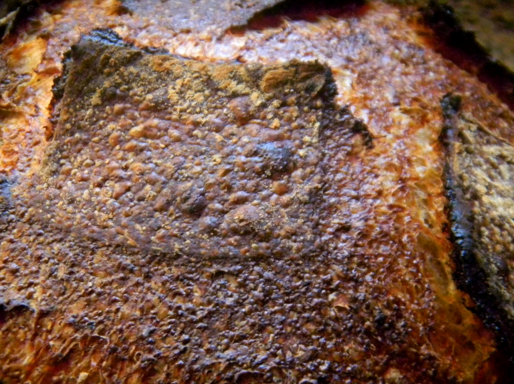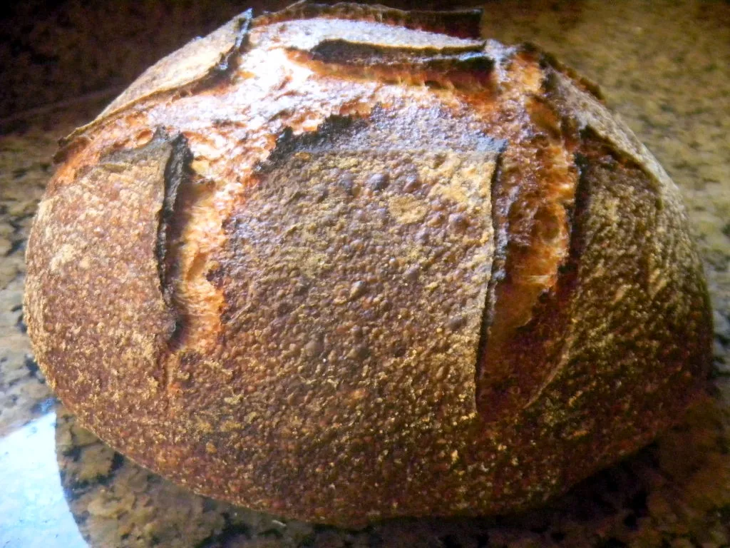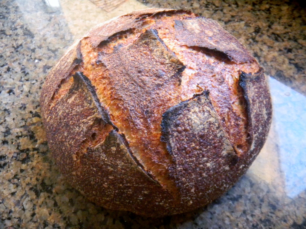 This bread bloomed and spring well with little blisters covering it.  It browned boldly, was super crisp and colored to that super dark mahogany color we love so much.  The curst on this one is bound to be more tasty than usual.  We will have to wait on a crumb shot till after lunch.