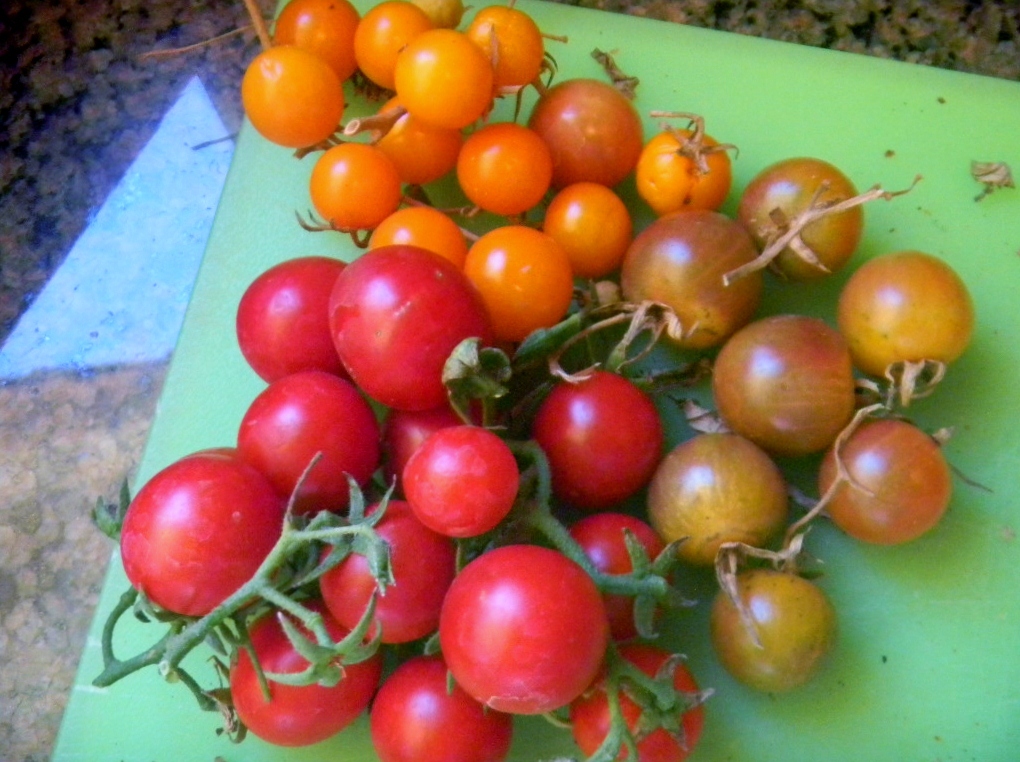 Home grown tri-color cherry tomatoes will make fora fine fresh tomato sauce for tonights pizza.