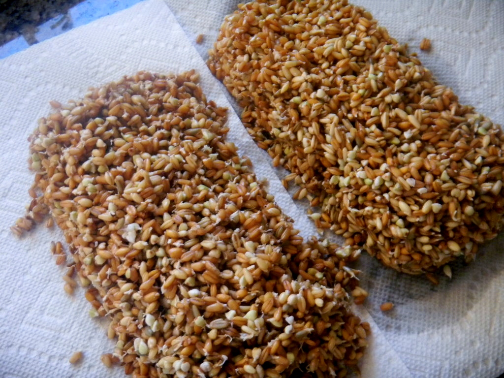 There was so much sprouted grain in this one, 500 g dry, that she had to use 2 sprouters to hold them all and 4 trays to dry then m in the dehydrator. She soaked the grains for 4 hours and then sprouted them for and additional 24 hours. She fried them at 105 F for 4 hours. When dry, the sprouted berries and grouts weighed 510 g.