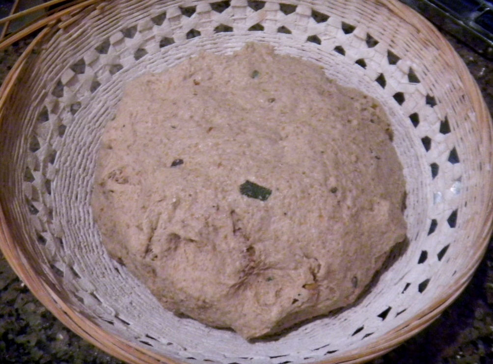 Once he levain hit the mix we did 6 sets of slap and folds with the first 3 sets of 8, 1 and 1 minute and the last 3 sets of 4 slaps and folds each. The walnuts and the sage went in on the first set of 4 slap and folds