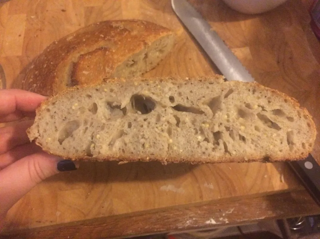 The dough felt airy and soft and pulled away from the edges of the container when I tilted it, and had increased in size some, but not double (maybe 30%). The dough did still feel a little wet and tacky when shaping. I shaped it into a boule and placed it into the fridge for an overnight rise. The next morning the boule was relatively flat and doesn't have much oven spring. The crust is crackly, but the crumb has bigger holes surrounded by denser areas.
