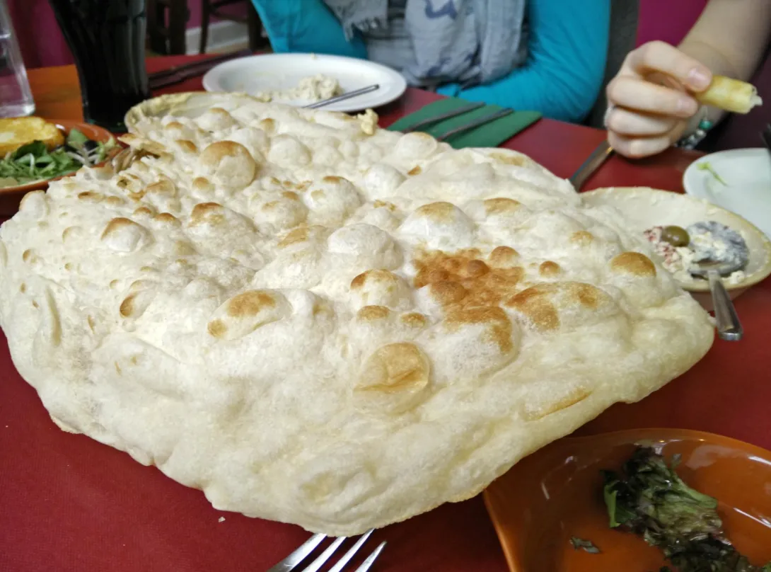There's a middle eastern restaurant near me that serves this amazingly light, bubbly flatbread (see pic). It's on the menu as a naan but doesn't resemble the type of naans you get in indian restaurants at all - it's incredibly light with huge bubbles on the top. Any ideas how I could go about making this at home? I'm guessing that the bubbles mean it's a very wet dough.