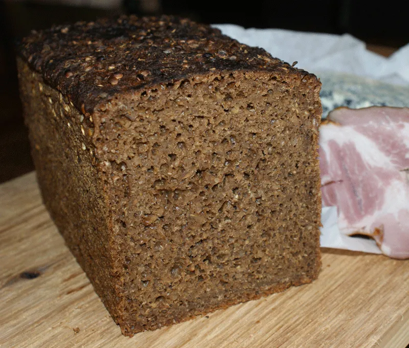 The GOST Borodinski uses a formula that conforms to the standards established by the Russian Bureau of Standards (GOST) and calls for 20% wheat flour, 80% rye. This loaf is built on a rye sponge and a scald of coarse rye meal, red rye malt, ground coriander and boiling water. The scald and sponge sit overnight and then are combined for a second, sugar-rich fermentation that lasts 3-4 hours. The scald-sponge is then combined with bread flour, fine rye meal, molasses, salt and a bit more red rye malt, bulk fermented 1 hour, then panned and proofed another hour or so. Topped with crushed coriander seeds, baked with steam 10 min at 450F, then reduced to 350F for 50 minutes, unpanned and finished at 350F another 10-15 minutes, until internal temp registers 195F or so. Let stand 24 hours before cutting. Surprisingly mild, complex flavors for so many sour-based fermentations -- sour, the sugars released during the scald, citrus notes of the coriander. Moist, very open crumb.