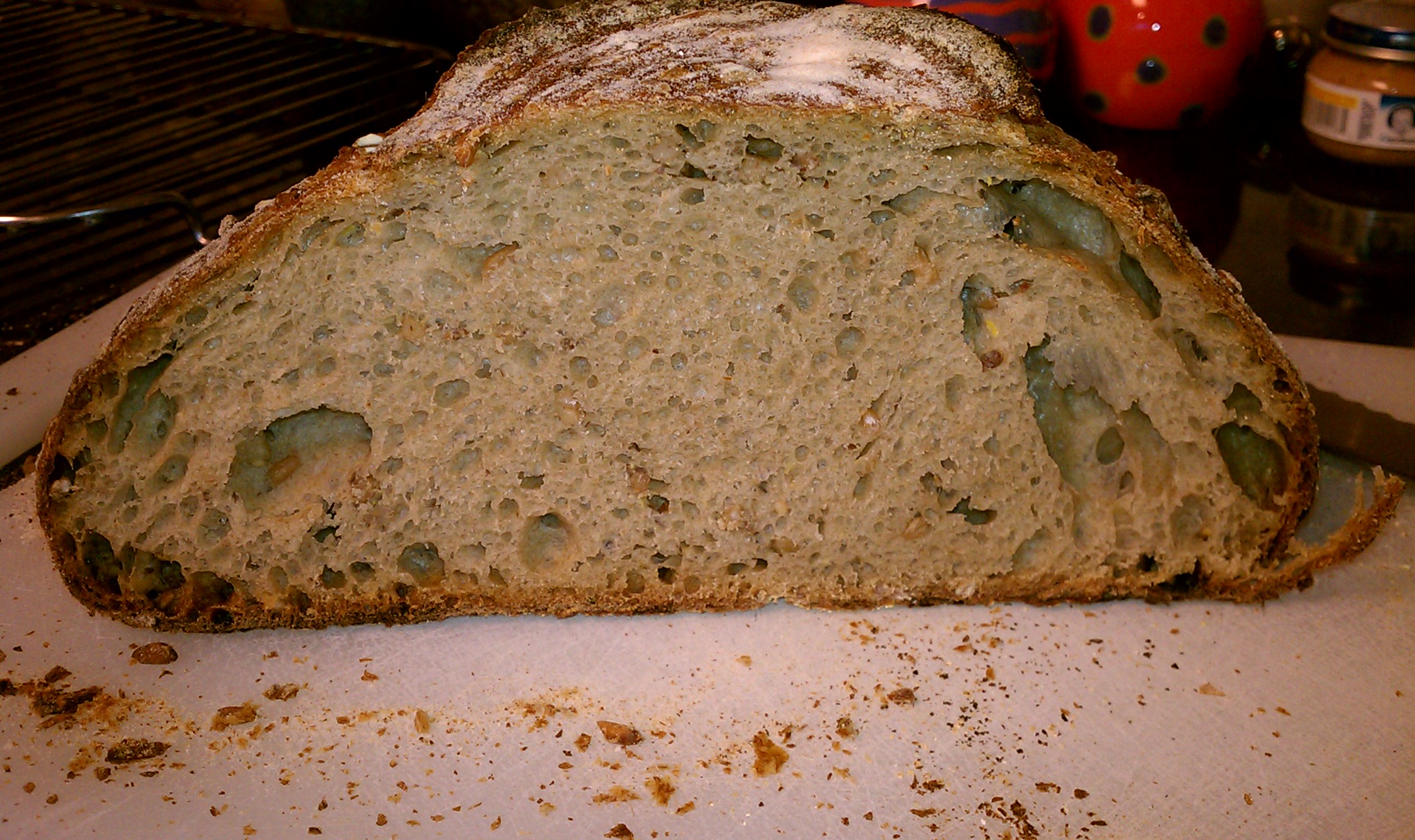 I love using a variety of grains - why eat boring when it's unnecessary? The crust on this one is crisp and chewy, but thin. The only thing missing was blisters. With my gas oven, I use a cloche cover on the stone, and while it retains moisture, there doesn't seem to be a way to introduce billows of steam...