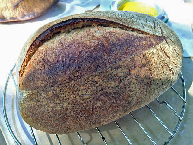 After baking the other loaves - two 900g bâtards of Hamelman's Pain au Levain with Whole Wheat -, we sliced the SFSD and tasted it with some fantastic local olive oil which I am going to have to buy next time I'm at J.'s store.