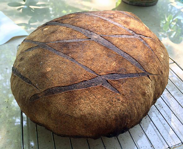 The SFSD with increase whole wheat was simply the best tasting bread I have ever baked. The crust was very crunchy. The crumb was well-aerated, very tender and light. The crust had a dark, nutty, mildly bitter flavor which was offset by the very sweet, milky flavor of the crumb. There was a subtle, late-appearing but lingering acetic acid tang, but the lactic acid flavor was much more prominent. After tasting a slice, with and without olive oil and declaring it delicious, J. said, "You know, growing up, I never liked sourdough bread, but this is wonderful."
