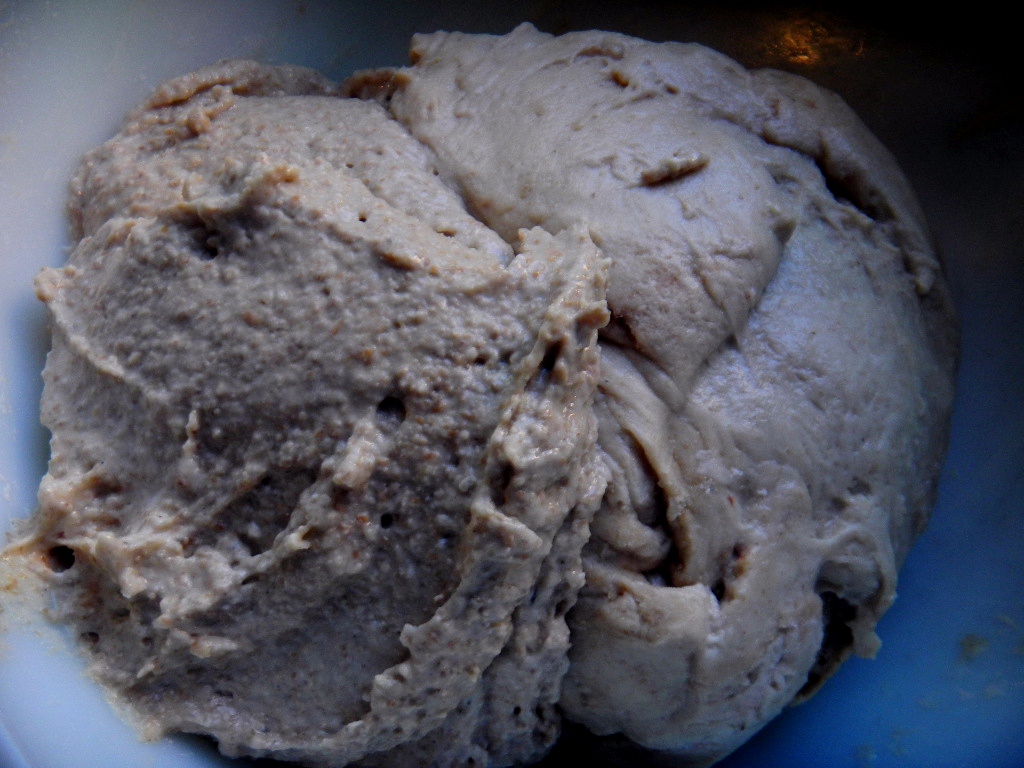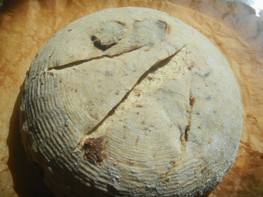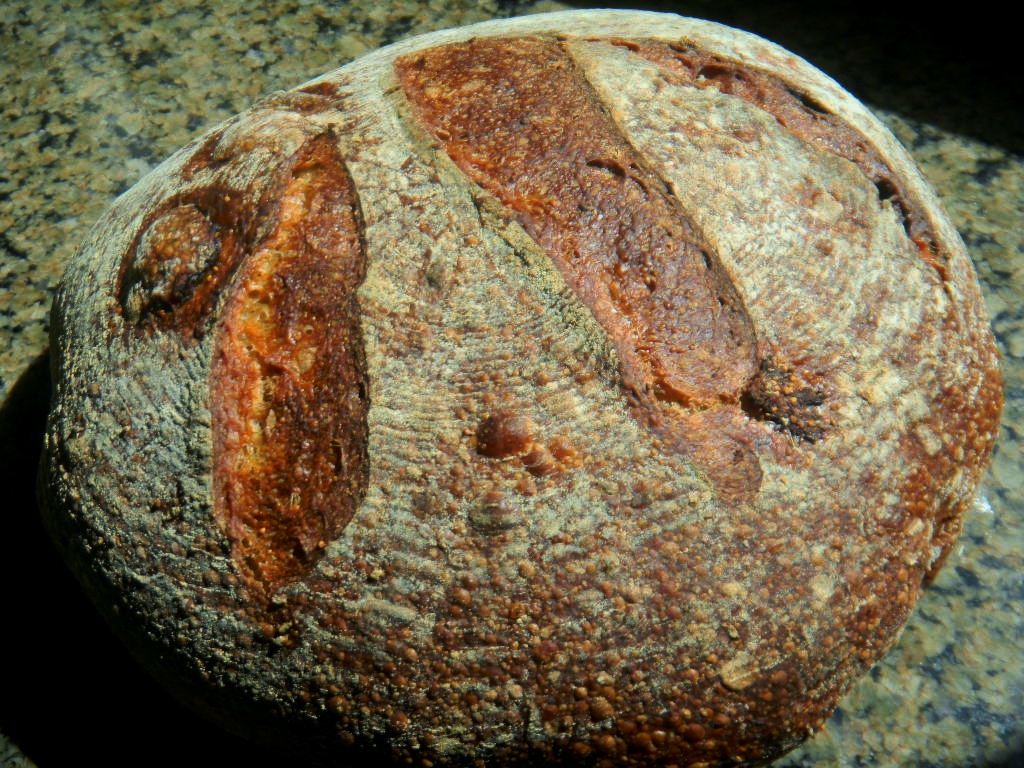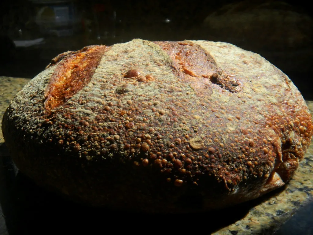 We followed out usual methods of late. 30% sprouted grain, dried in the dehydrator, milled and sifted to about 23% extraction. The hard bits are then fed to the previous week’s reserved small amount of starter to make this week’s levain that is then retarded for 24 hours before a small portion is reserved for next week’s bake and the rest used for the levain for this weeks bread. The pre -fermented flour was 17% and the overall hydration was 78%.