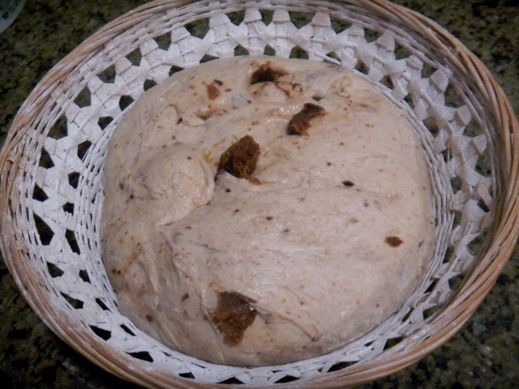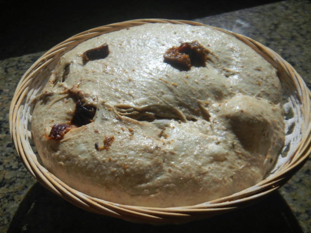 The re-hydrated figs and 1 T of Anise seeds were incorporated during the first set of stretch and folds and they were thoroughly incorporated after the 3rd set. Once the gluten development was done we pre- shaped the dough into a boule and then final shaped it and placed it in a lightly rice floured basket, bagged it in a used trash can liner and put it in the fridge for 15 hour retard.