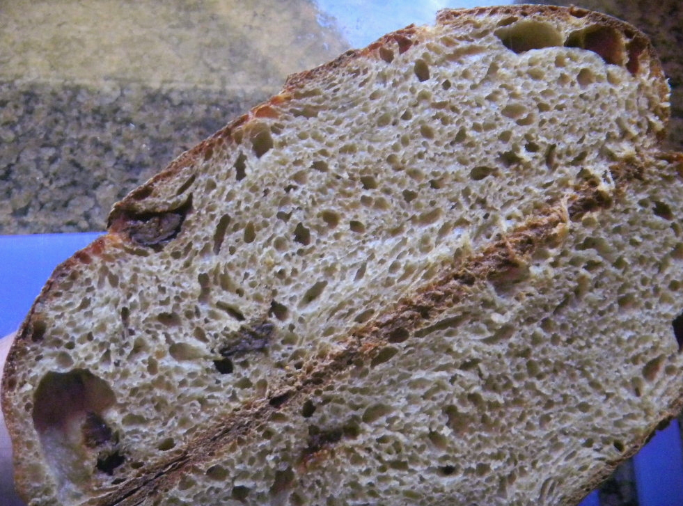 We immediately forgot to turn the oven down to 450 F as planned but after 18 minutes of too hot oven during steaming we took the kid off and turned the oven down to 425 F- convection - for another 15 minutes until the bread tested done with a few thumps on the bottom. We left the bread on the stone with the oven off and door ajar for 5 minutes more to crisp the crust some more.