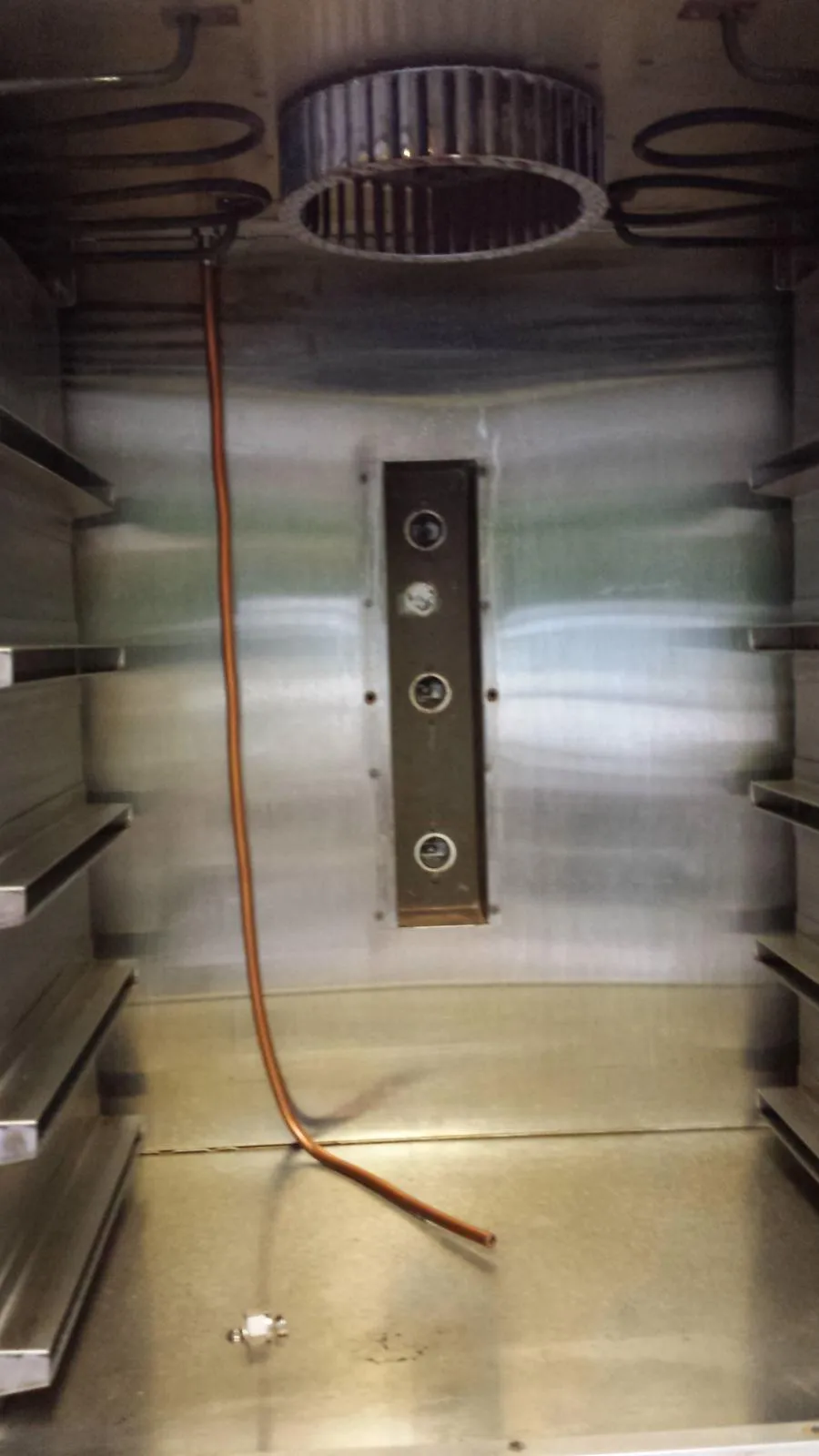 Thanks for the info. I believe mine would probably be considered a fan oven as the elements are in the top under a stainless baffle (temporarily removed for the modification) which directs the air from the fan down the sides and out the channel as shown in photo. I am planning to inject steam by a steam generating machine rather than water. Not sure how that will affect the amount of time for adding steam