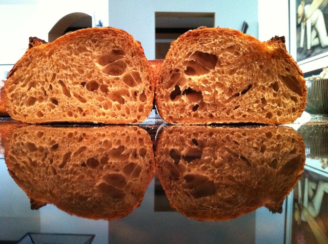 For whatever reason, the batards, both inside and out seem to always appear in these photos more red than they actually are.  Crust being browner and the crumb being a little whiter.