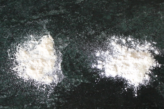 The durum atta is on the left, contrasted with an unbleached AP flour on the right. The atta flour has a slightly grittier feel when rubbed between thumb and forefinger. While the naked eye isn't always a reliable measuring tool, the particle size of the atta seems to be just slightly larger than the particle size of the AP flour.