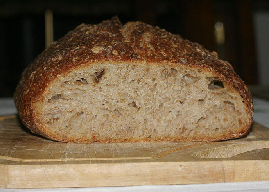 No explosions, no wonky bread, no unsightly cracks underneath. It's a bit on the flat side, but then I guess with the percentage of wholegrain flour, it won't spring as much as a predominantly white loaf. I won't be able to fit that much dough in my chicken brick, but I have discovered a pizza stone in the cupboard, so next time I might try using that and see if it makes any difference. Part of my problem seems to be that the top crust sets too early.