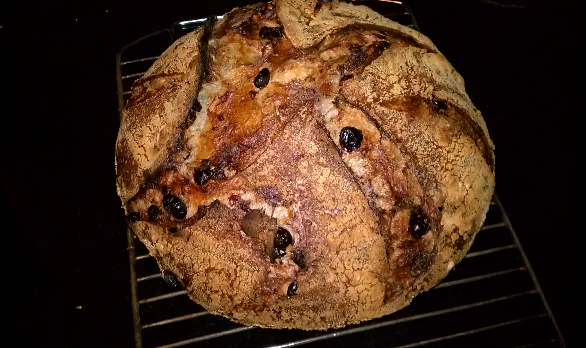 A really crazy, busy week. I fed the starter, but did not get round to making the dough until the next evening. There was no time to make the loaf, so the dough sat in the fridge for another night and day. The next evening I took it out, briefly kneaded it and formed a loaf. Back in the fridge overnight. She did not look impressive by the next morning. I was in a rush and left the oven on too high a temperature. She burst out of her skin, and rewarded my neglect with a really tasty loaf with a great crumb. Thank you sourdough!