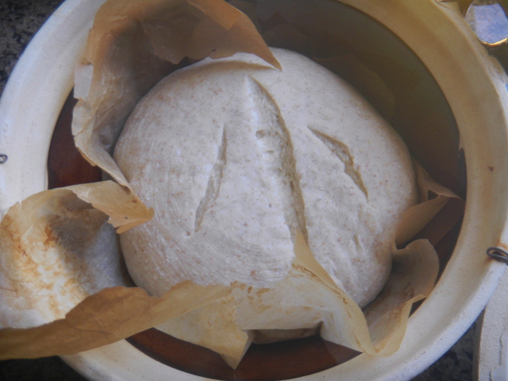 Once the half hour was up we left we brought the boule inside but left it to proof on the counter as we heated up Big Old Betsy to 435 F with our pre-soaked Chinese Sand Clay Pot inside.