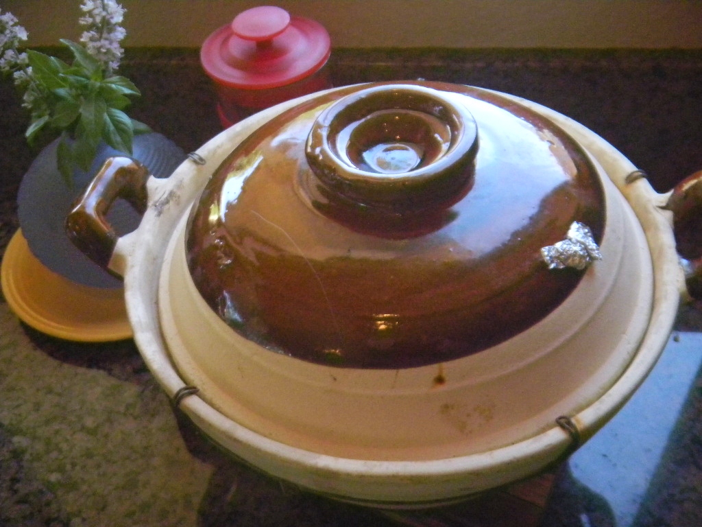 Had to plug the hole in the Chinese clay pot with some aluminum foil to keep the steam in.