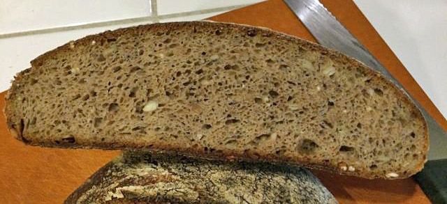 This made a very wet dough that did develop some strength with the stretches and folds and, especially, with rather tight pre-shaping and shaping. Still, with the high percentage of whole wheat flour and the additional seeds and flaked grains, loaf volume was less than most of the FWSY levains.