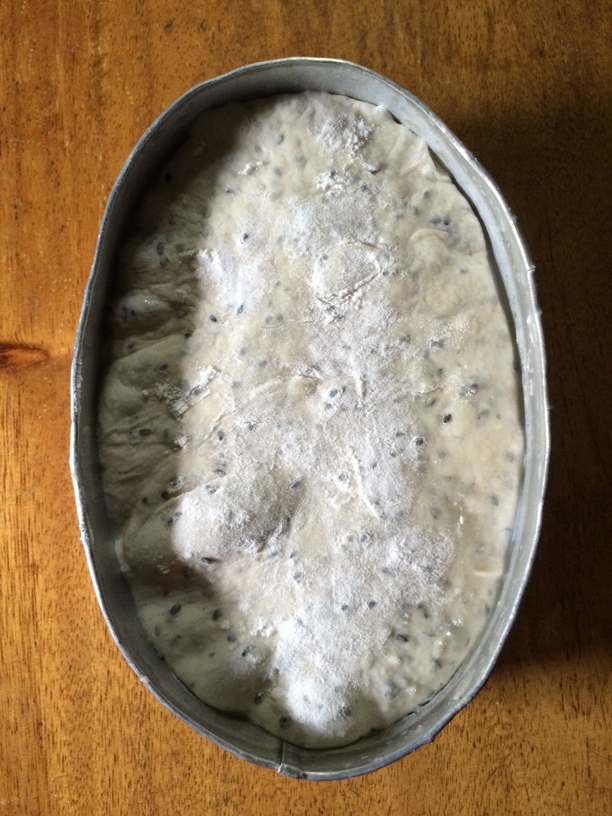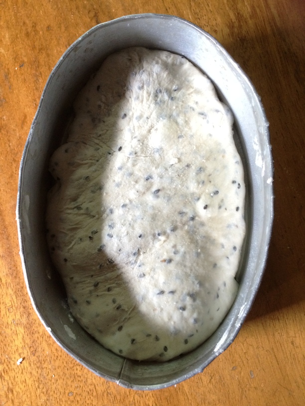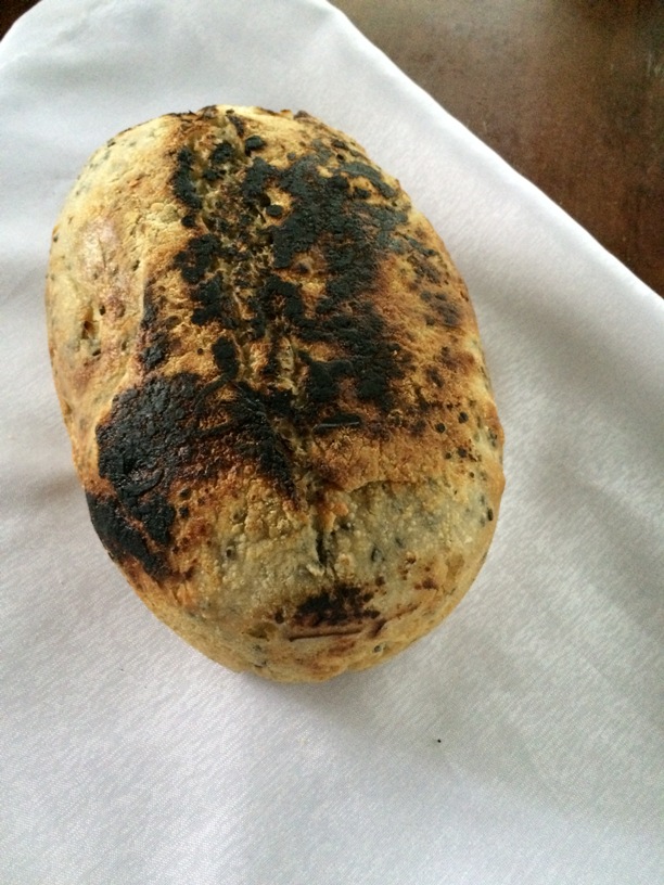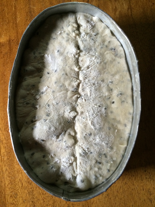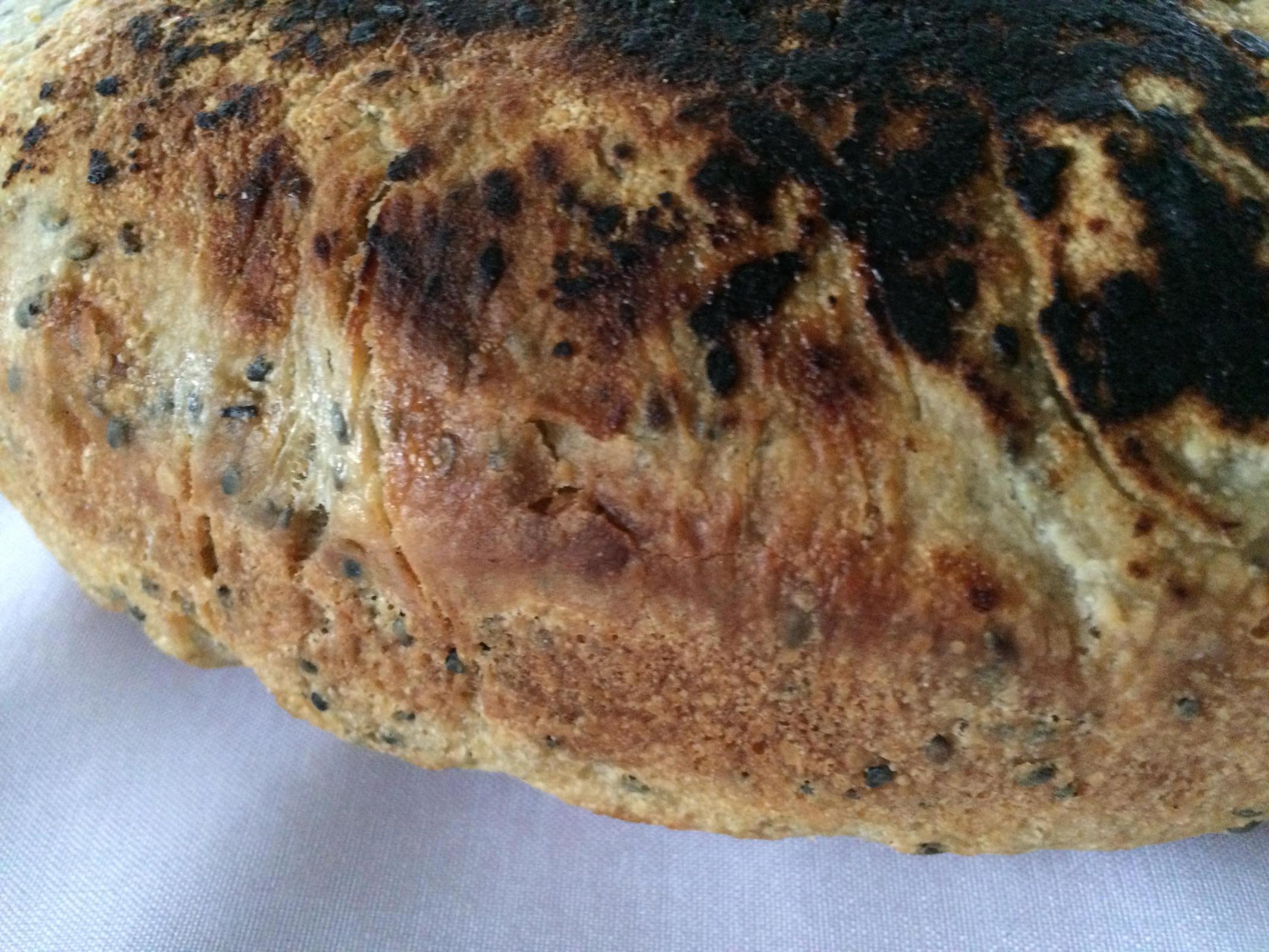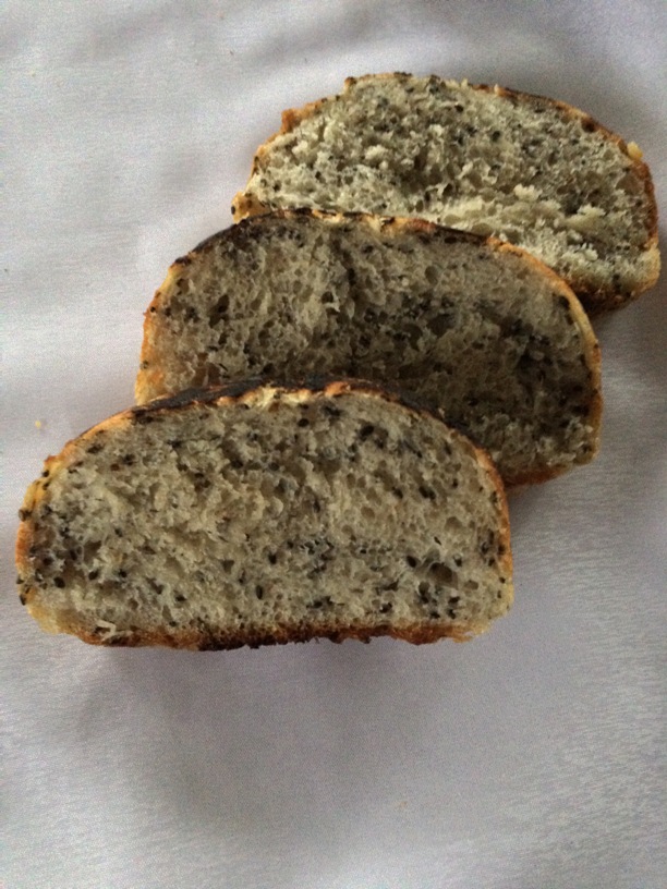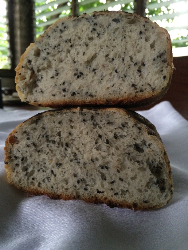 Crust is thin and very crispy when it came out of the pot but became soft and chewy when it cooled, crumb is moist, soft and chewy; full of sesame fragrance and flavor which is pronounced but not overpowering, just right. The black sesame contrasts nicely with the creamy crumb, very pretty!