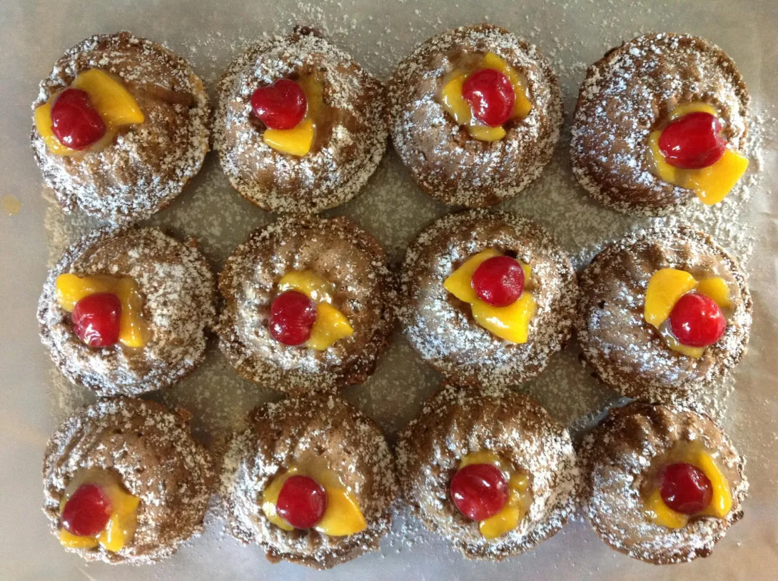 There really is no recipe, I bake by feel. The secret to the volcanoes is simply Wilton's Mini Fluted Tube Pan; once the muffin-size cakes have set, you just fill the holes with what ever filling you like, from glazed fruit to cannoli crême. I've found that greasing and flouring the pan with some salt added in greatly helps to prevent scorching and makes "release" a breeze.